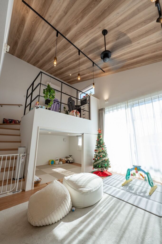 ③【LDK】吹き抜けとロフトがつくる、開放感あふれる立体的な約15帖のLDK。
