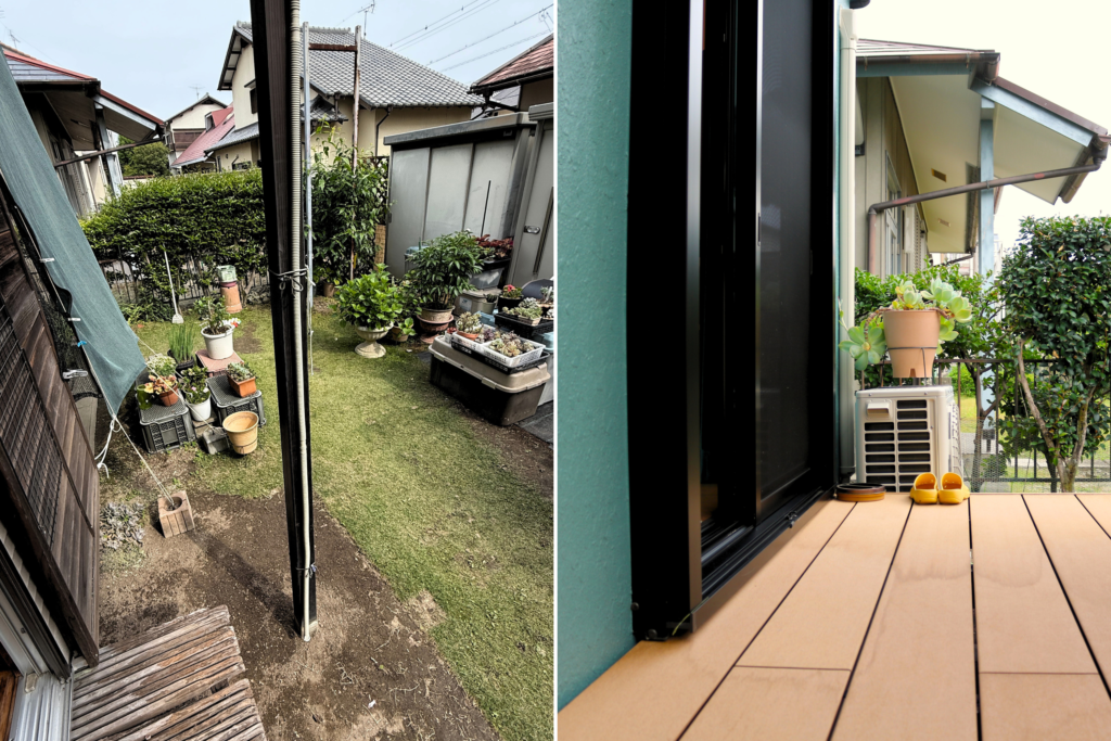 増築部分にウッドデッキを新設。雨がしのげるようにテラス屋根を設けました。趣味のガーデニングも楽しめそうですね♪