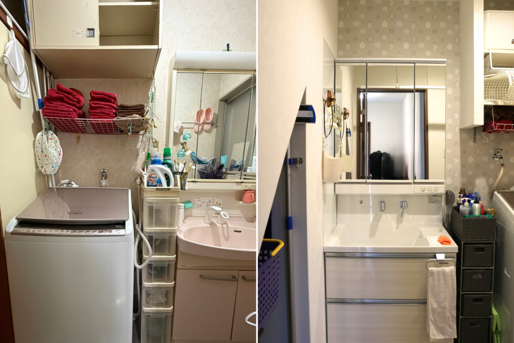 洗面台と洗濯機の配置を変更し、使いやすい動線を確保しました。階段下収納を有効活用しスッキリとした印象に!