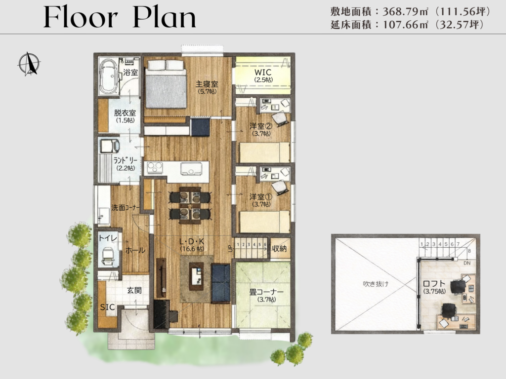 吹き抜けとロフトがつくる、開放感あふれる立体的な約15帖のLDK。