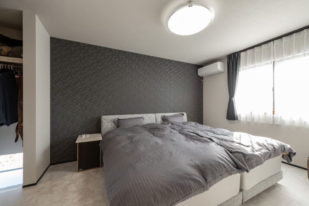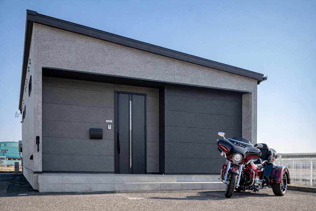 グレーを基調に、2色のアクセントウォールを採用した落ち着きのある外観。