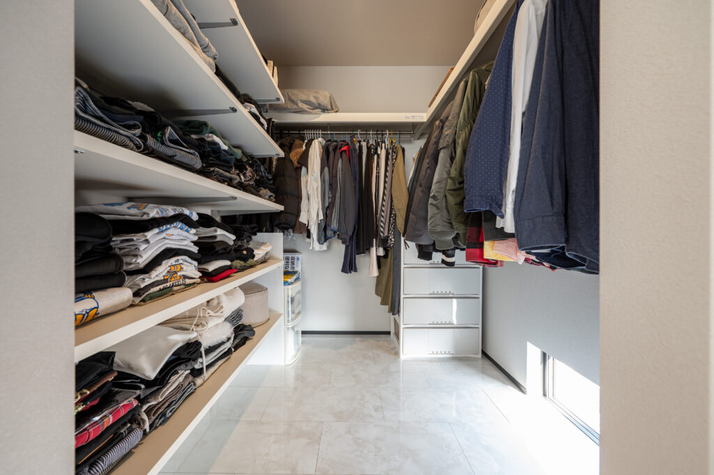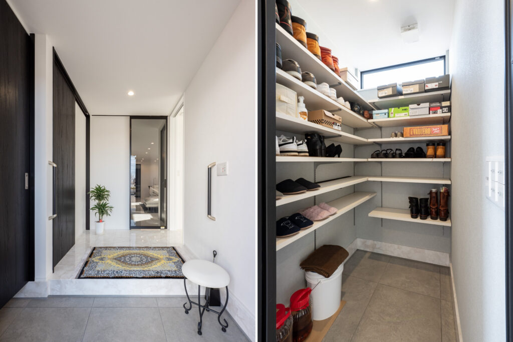 土間収納には可動棚を多めに設け、靴はもちろん趣味用品や季節物まで納可能。