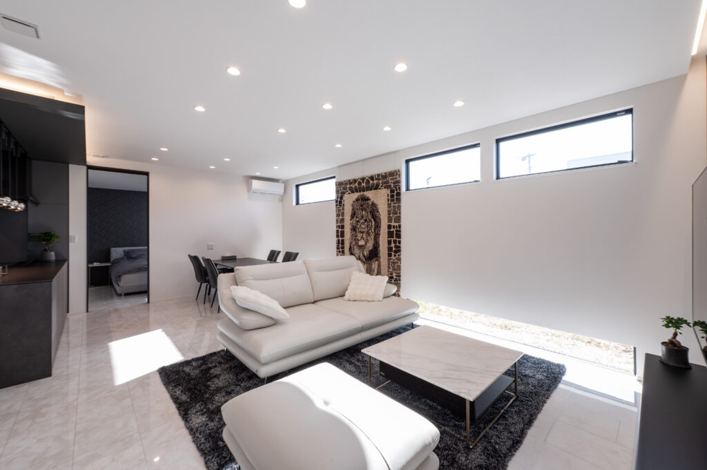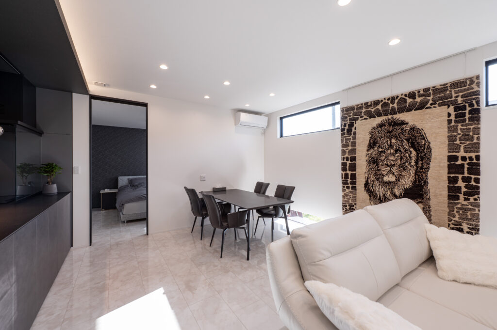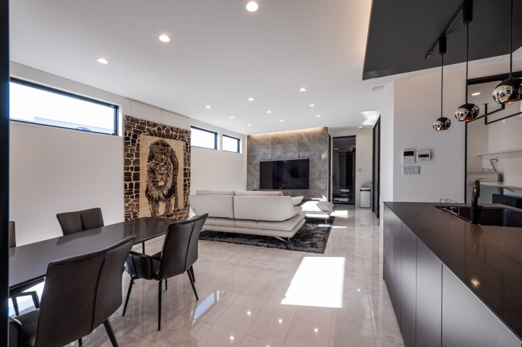 高級感のある大理石調の床が特徴の開放的なLDK。