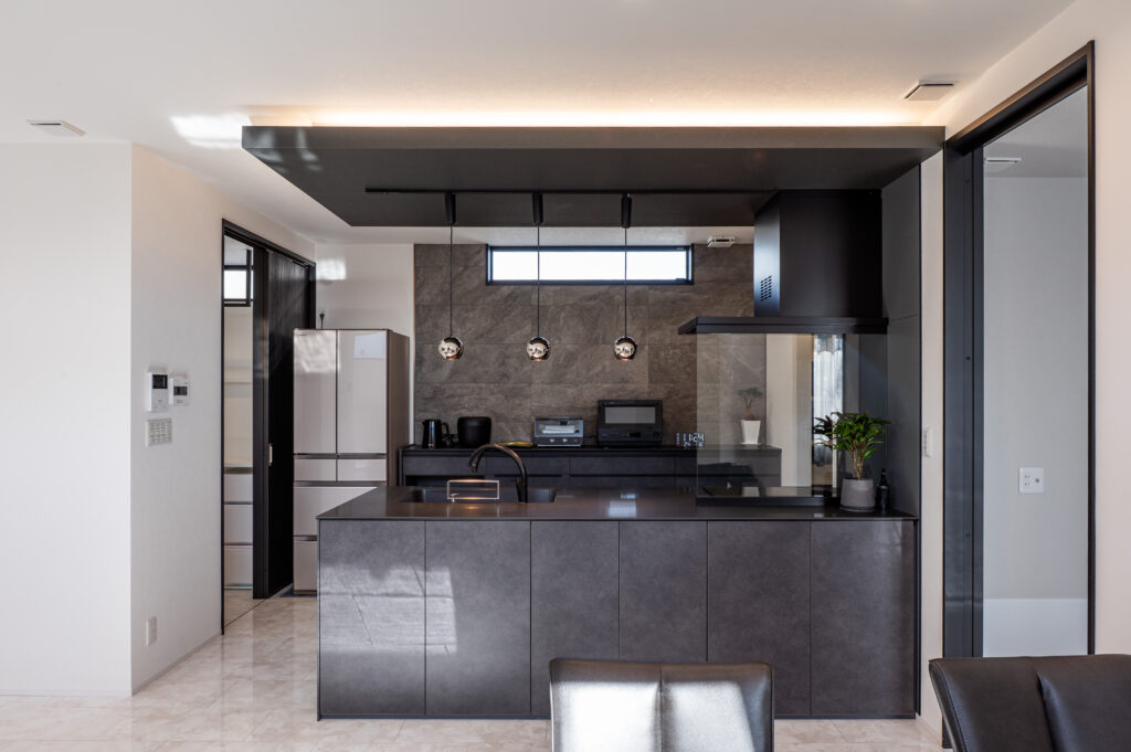 グレートーンでまとめた内装に、素材感と照明で奥行きを演出。