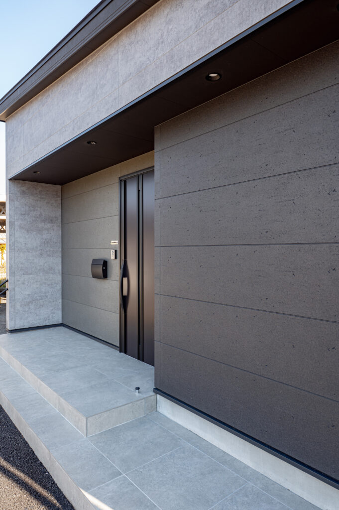 600角タイルでゆったりと設けた玄関ポーチが、住まいへの期待感を静かに高めます。