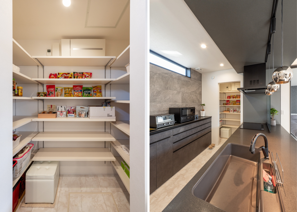 キッチン横にはコの字型のパントリーを設け、収納力と作業効率をUP。