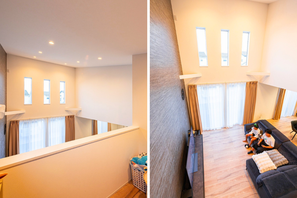 勾配天井の吹き抜けリビングは、南窓からの自然光で明るく解放感抜群!