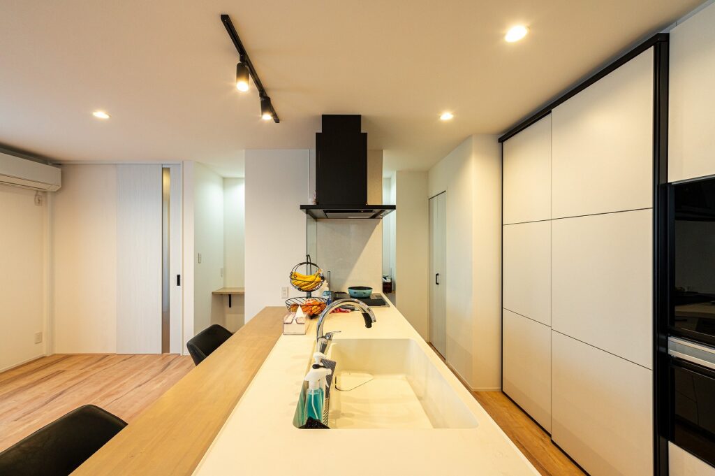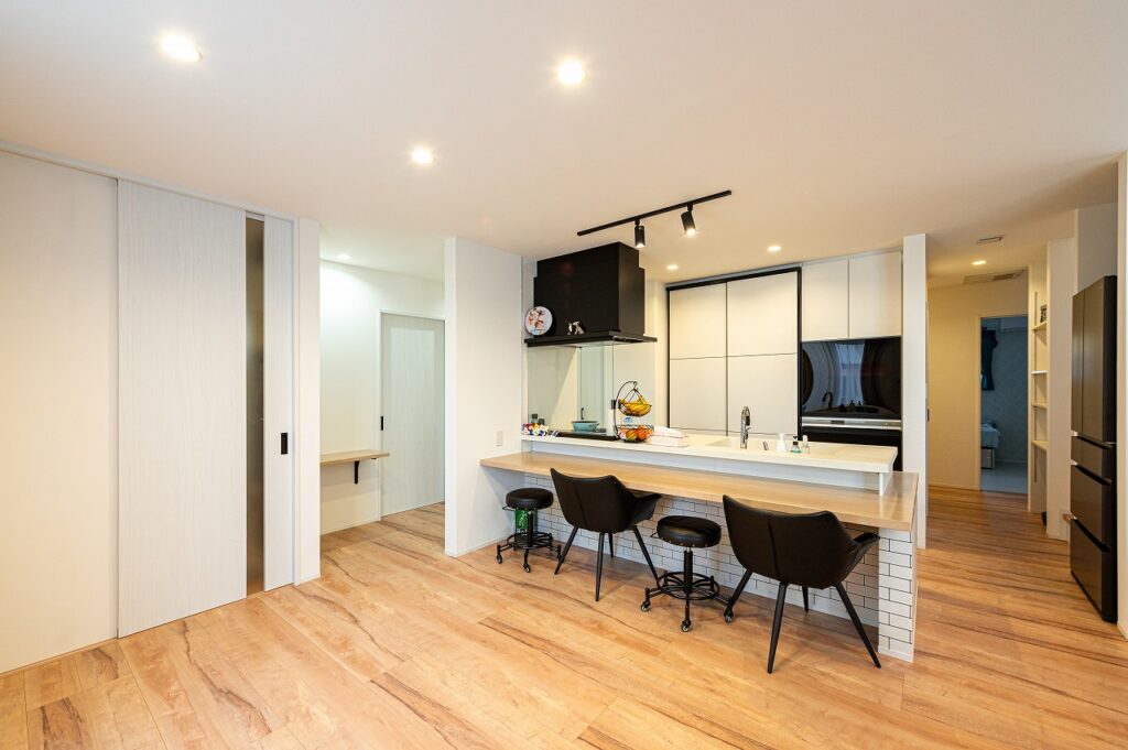 冷蔵庫は家族が使いやすい動線上に配置し、キッチン背面は引き戸で隠す収納を実現しました♪