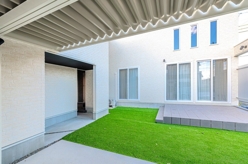 芝とタイルが調和し、心地よい抜け感とプライベート感を演出します。