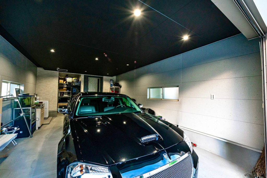 ゆとりあるスペースで車の整備や趣味の作業も快適です。さらに、奥には約3.5帖の収納スペースを完備し、収納力も抜群!