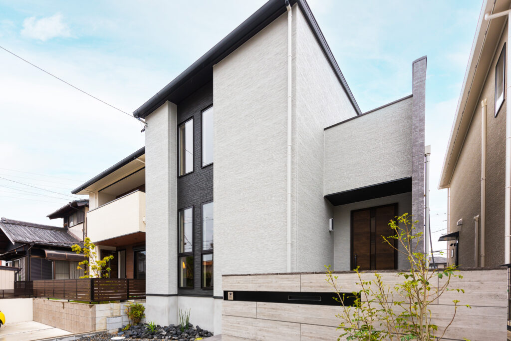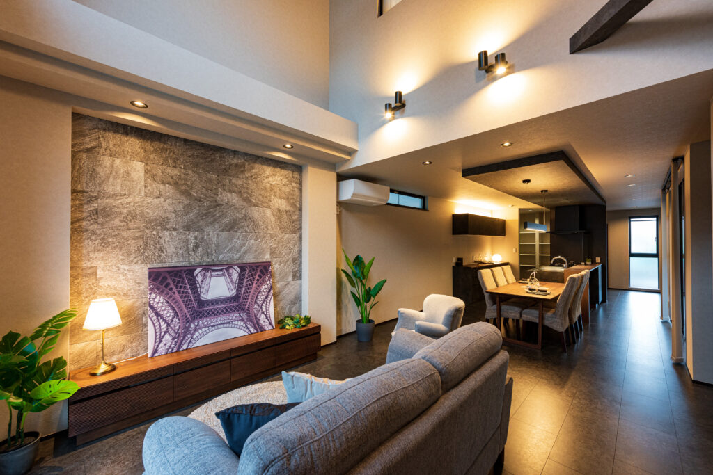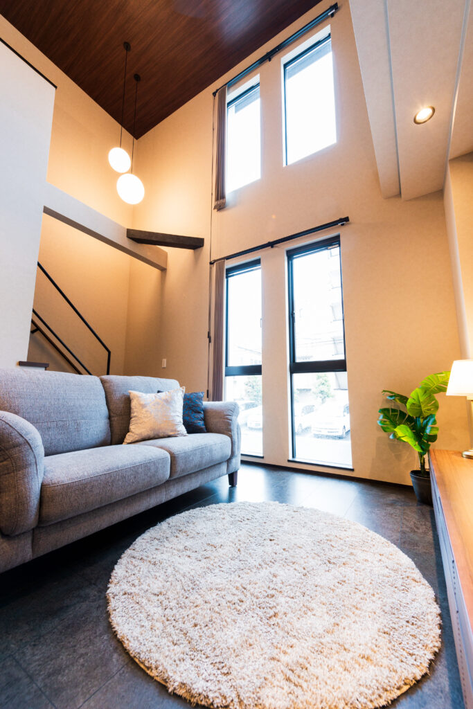 高さを生かしたデザインが家全体に伸びやかな印象を与え、まるで外の景色まで取り込んだかのような広がりを感じさせます。