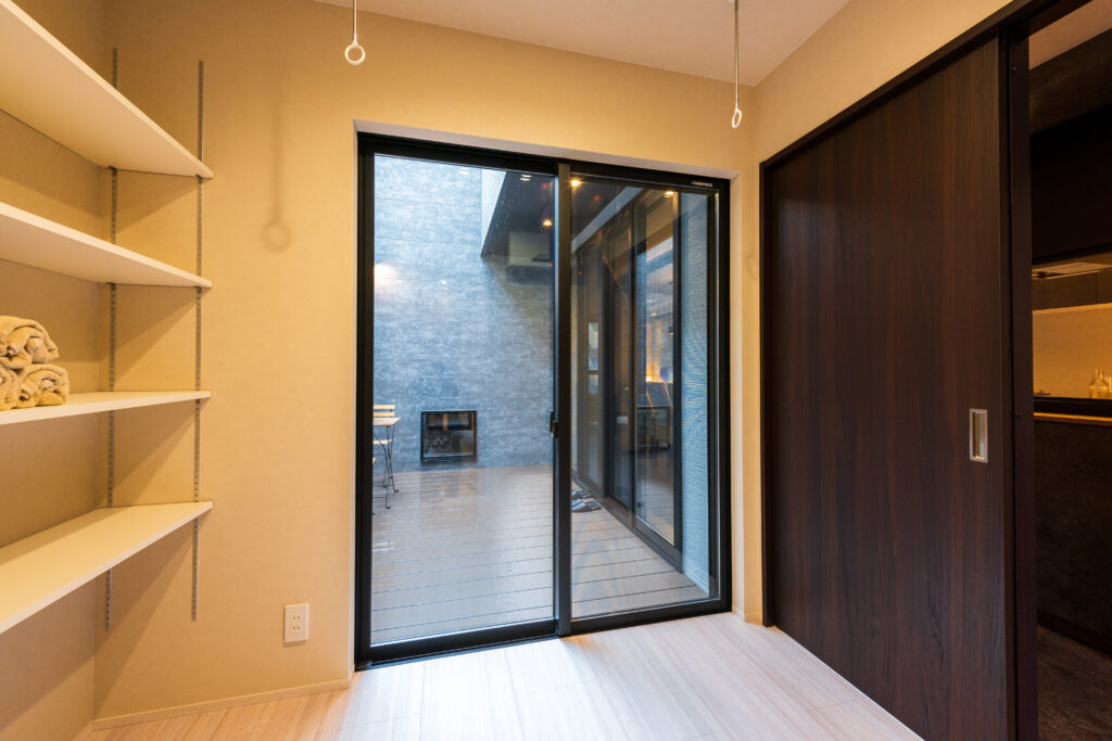 中庭テラスが続く脱衣室。洗濯物の出し入れや外気浴もでき、雨の日の室内干しも楽々です。