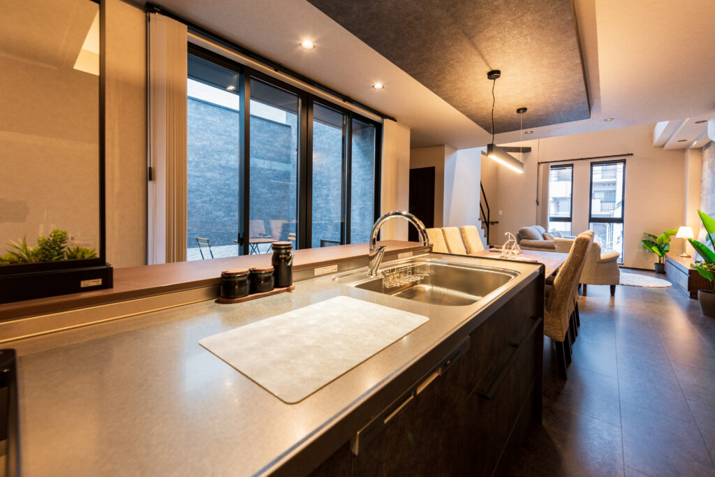 間取りの中心にあり家族の様子を感じながら楽しく料理ができます。正面には、中庭テラスがあり明るい陽射しが降り注ぎます。