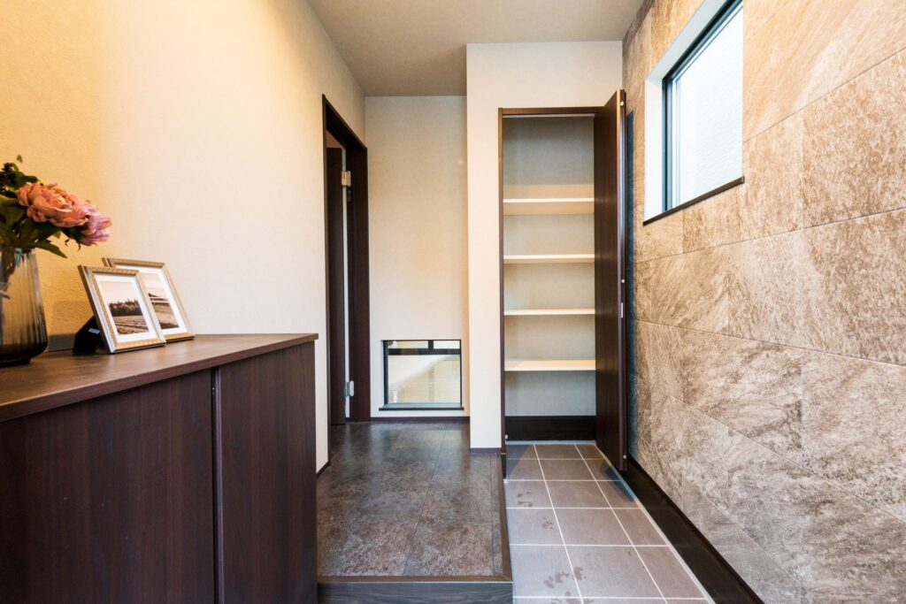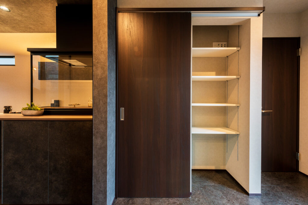 キッチン横のパントリーは、冷蔵庫設置も考え広めに確保。稼働棚もあり、食品や日用雑貨も沢山保管できます。