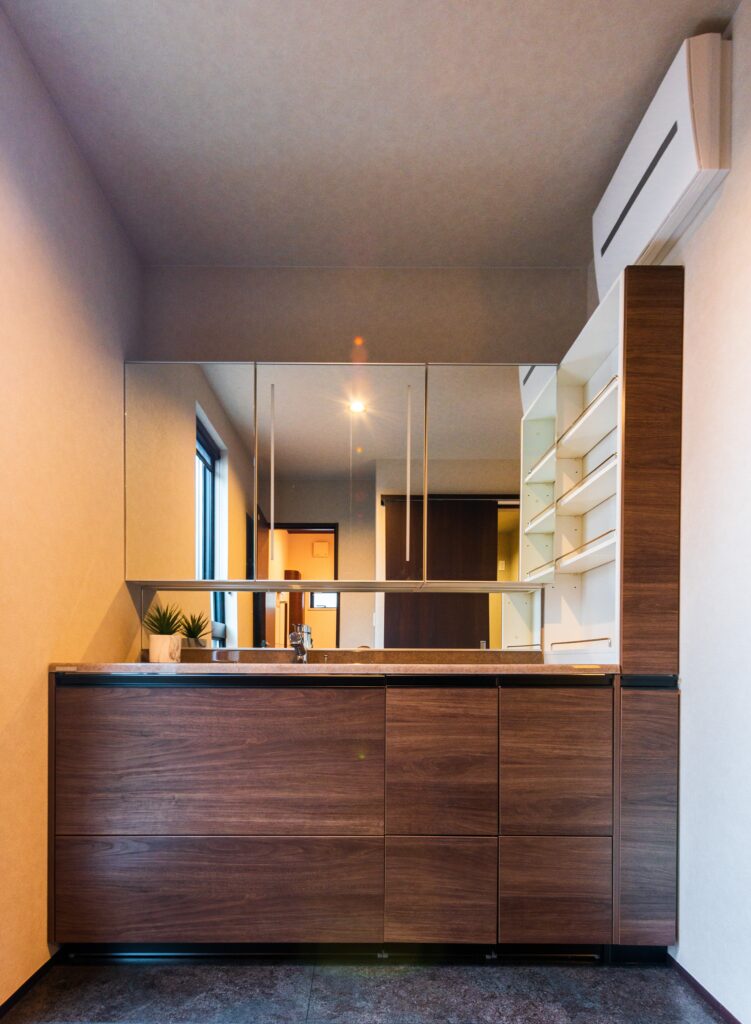 木目の温もりを生かした洗面台は、毎日の身支度を心地よい時間へと変えてくれる空間。
