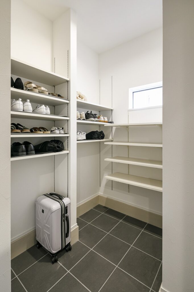 土間収納には壁一面の可動棚で家族全員の靴屋小物をスッキリと整理できます。