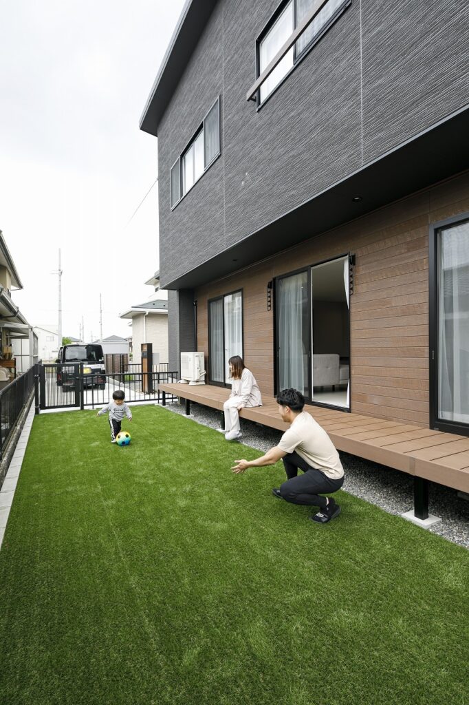旗竿地を活かした南向きの広いお庭。ここなら安心してお子様も遊べます。