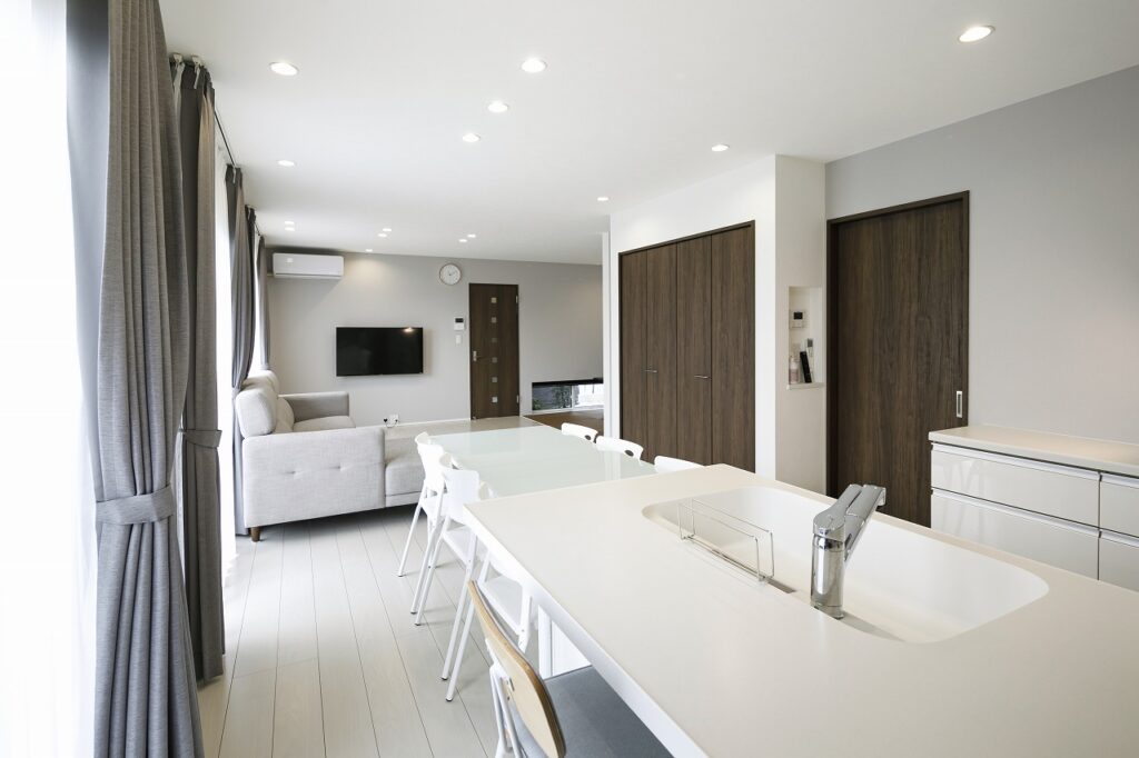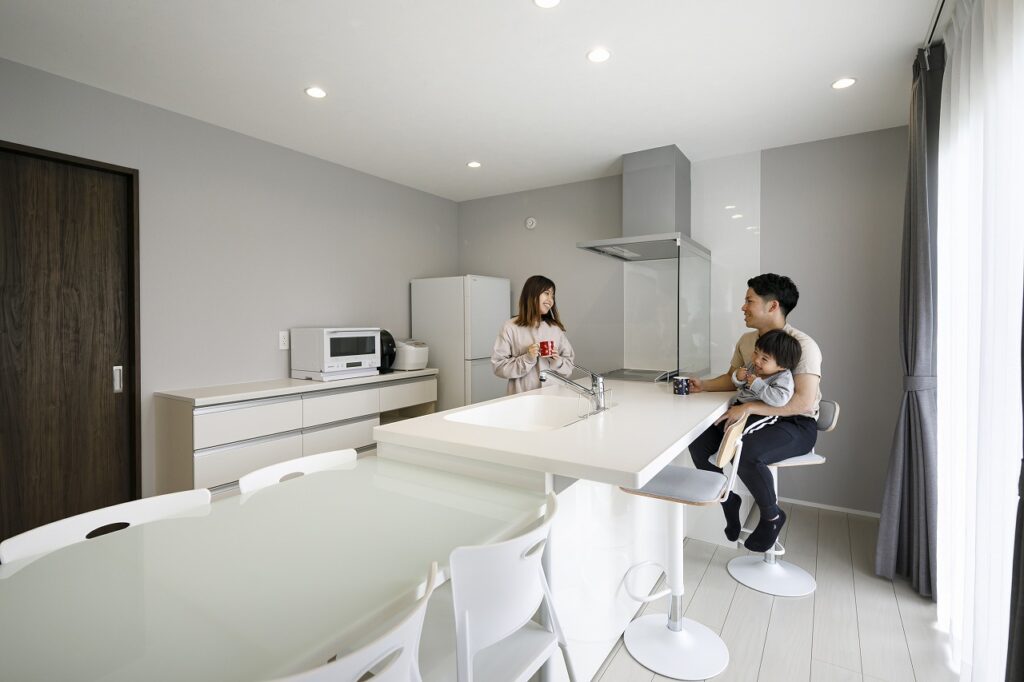白を基調とした開放的なキッチン。料理をしながらお子様の勉強を見たり、家族みんなで楽しく過ごせます。