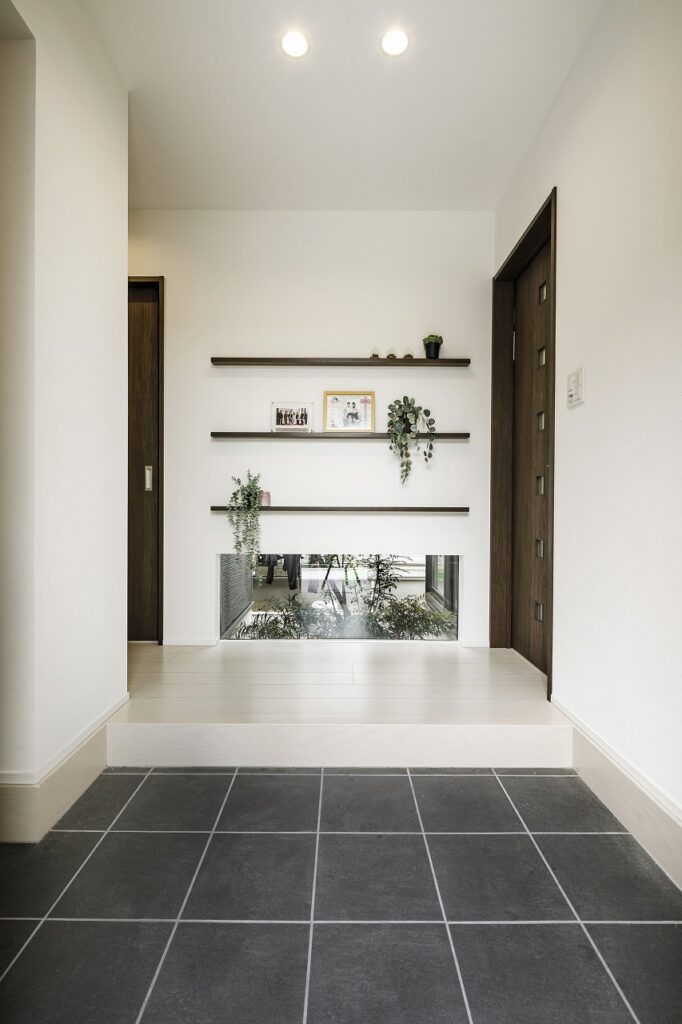 中庭が望める広い玄関ホール。壁の飾り棚も合わさり、お洒落でモダンな空間。