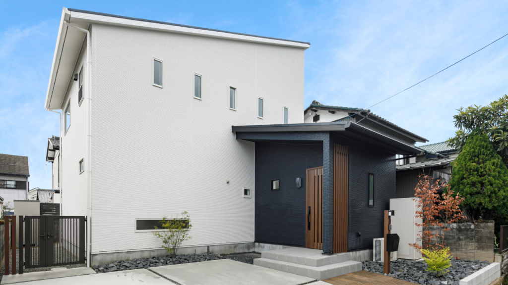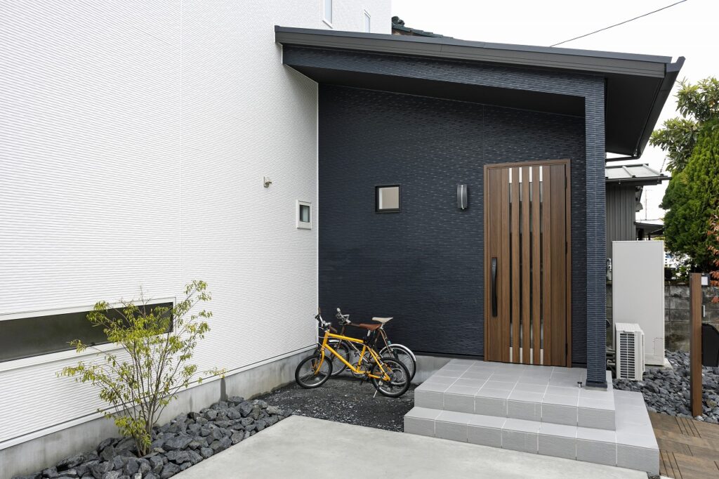 木目ドアと外壁のコントラストが、モダンで落ち着いた雰囲気の玄関。