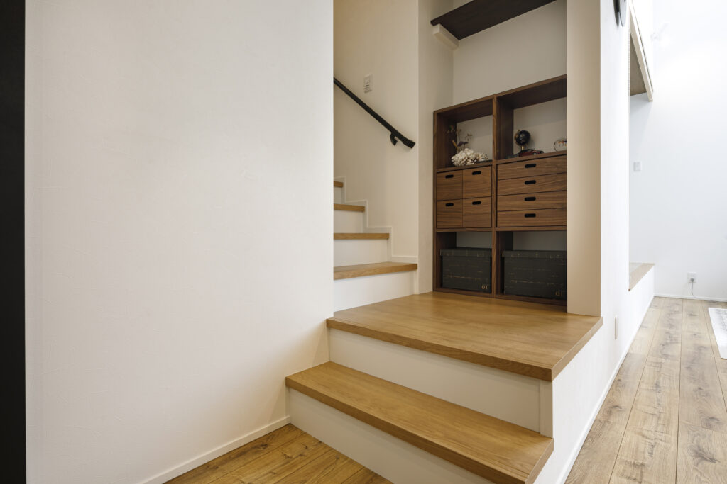階段にスキップを設け、飾り棚が綺麗に収まりように設計しました。