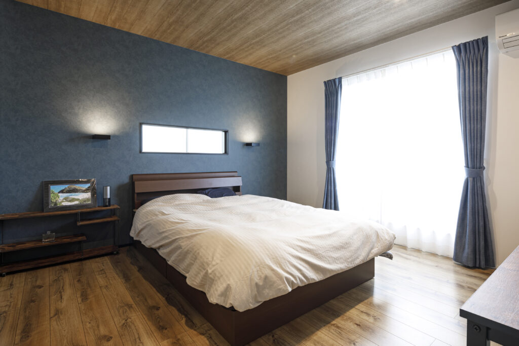 ブルーのアクセントクロスとカーテンを合わせて、リラックスできる空間になりました。