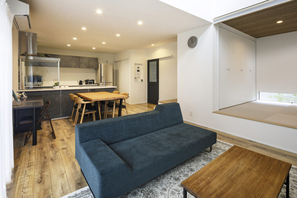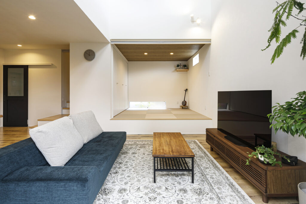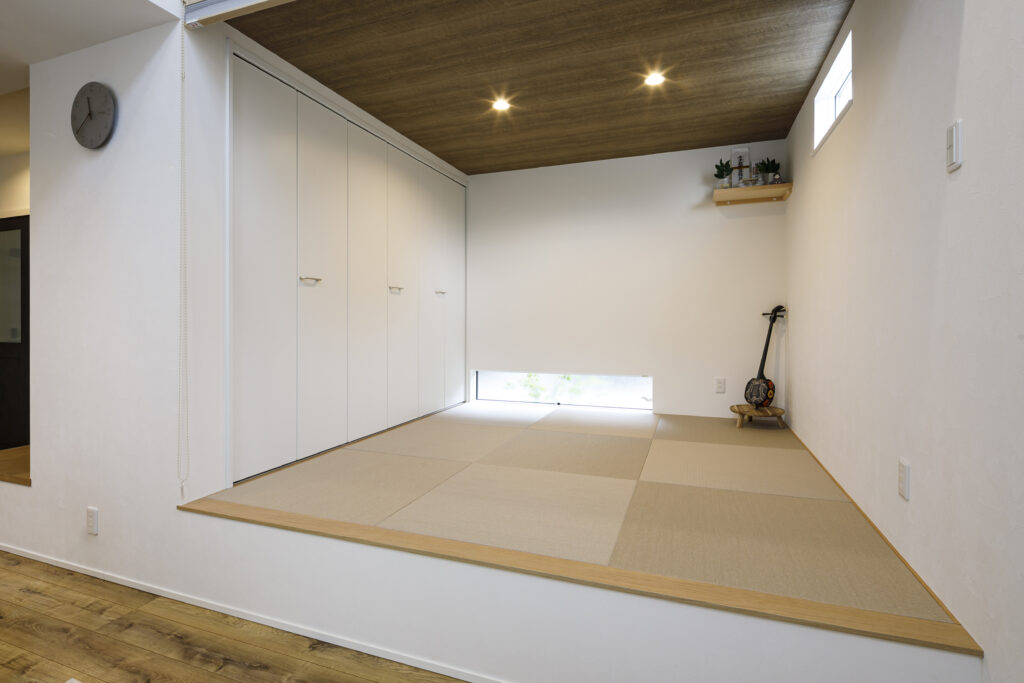 和&モダンの落ち着いた空間の融合が心地いい、段差でゆるやかに区切られた畳コーナー。