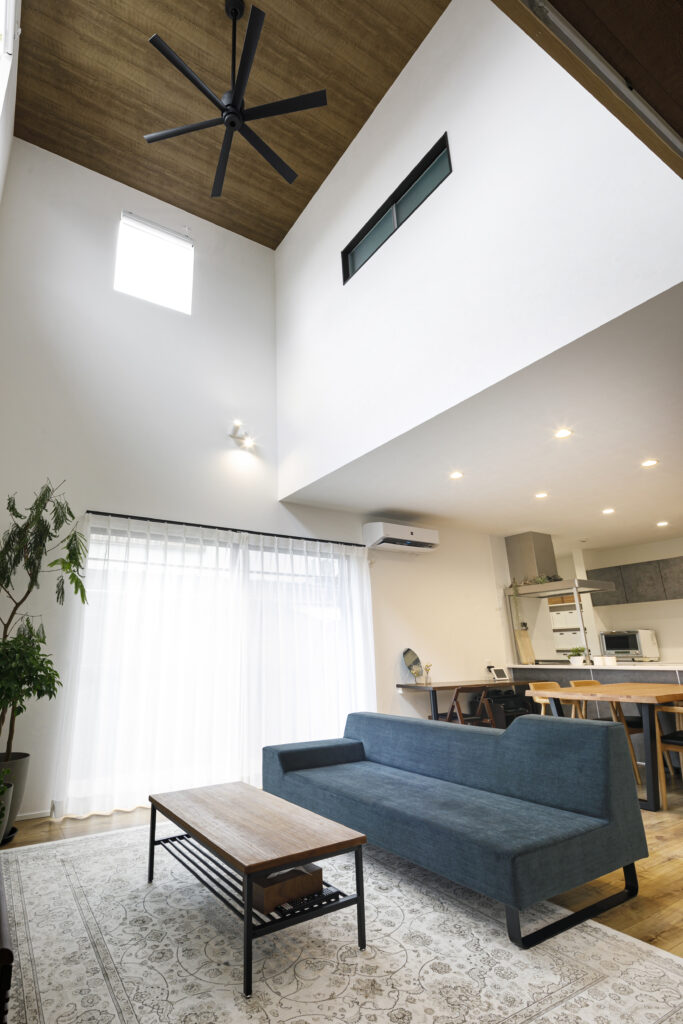 空へと広がる約5.3mの吹き抜けに、窓からやさしい光が降りそそぐ開放的なリビング。