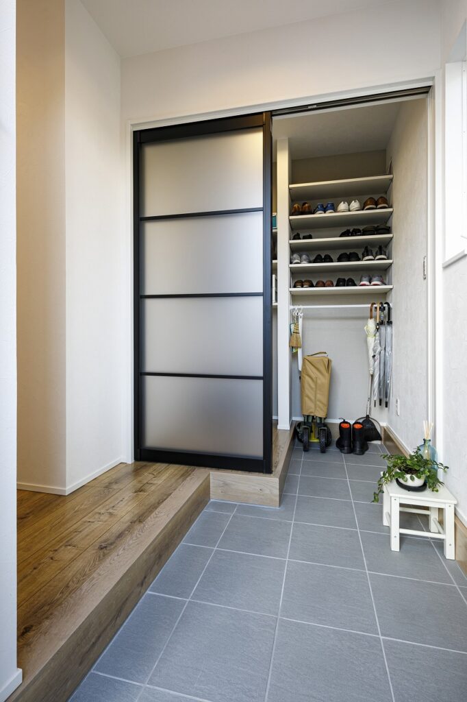 来客時は引き戸を閉めて生活感をカバーできるシューズインクローク