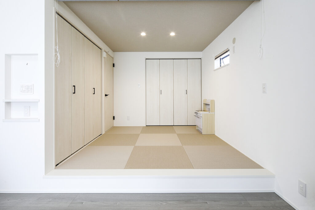 小上がりの畳コーナーにはリビングと色合いの合う、琉球畳を使用。天井にロールスクリーンを設け目隠しも出来ます。