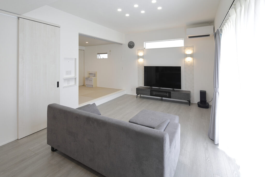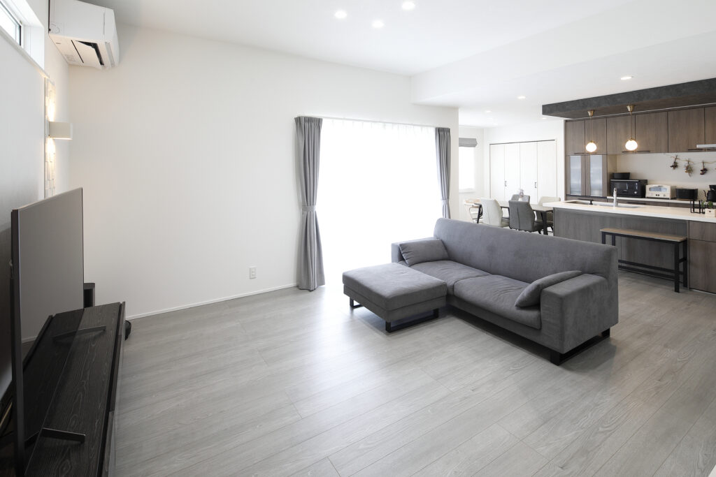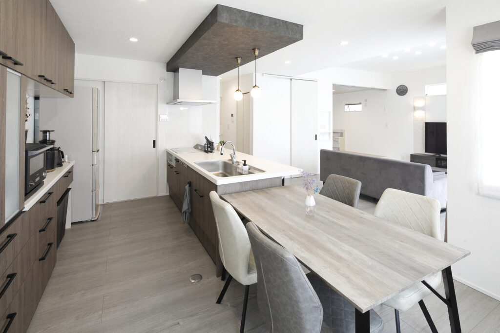 リビングは天井高を通常よりも40㎝も高くしていただいたので、開放感がありますね!収納も玄関や廊下、畳コーナーなどに多く設けてもらったので物が溢れかえらず便利です。キッチンは冷蔵庫の扉を開けても通れるくらい広くしてもらいました!