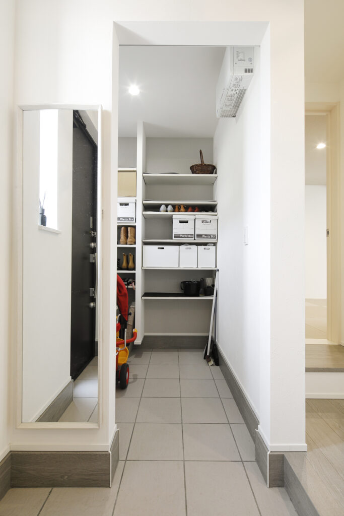 玄関横には、たっぷり収納できる土間収納。靴や日用品をすっきり整理整頓できます。