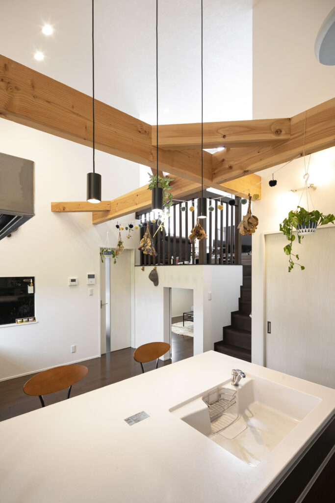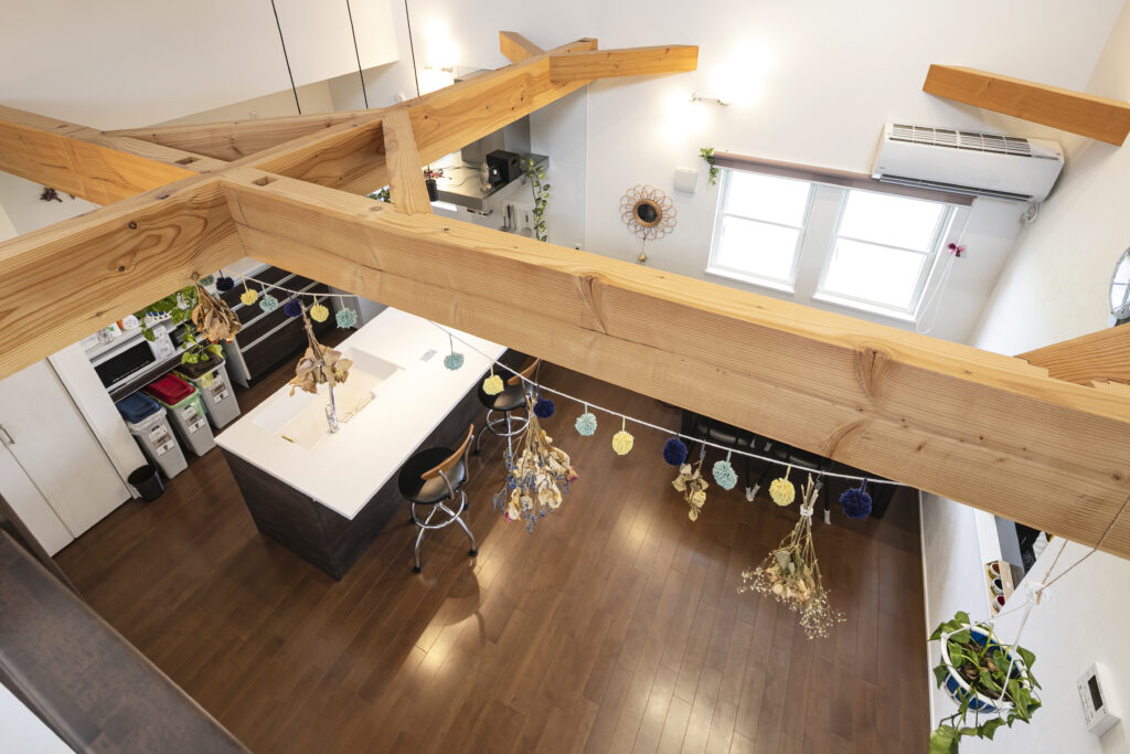 リビングから見下ろす事が出来る、開放感抜群のダイニング・キッチンスペース。むき出しの梁がより一層オシャレ感を演出。