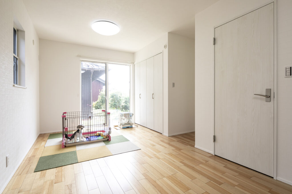 約10帖ある子ども部屋。将来的に2つに仕切ることができるように、あらかじめ扉も2つ設けてあります。