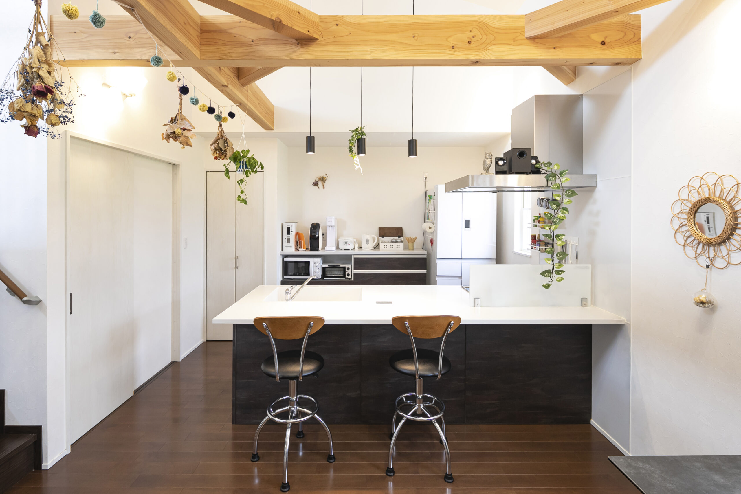 リビングから見下ろす事が出来る、開放感抜群のダイニング・キッチンスペース。むき出しの梁がより一層オシャレ感を演出。