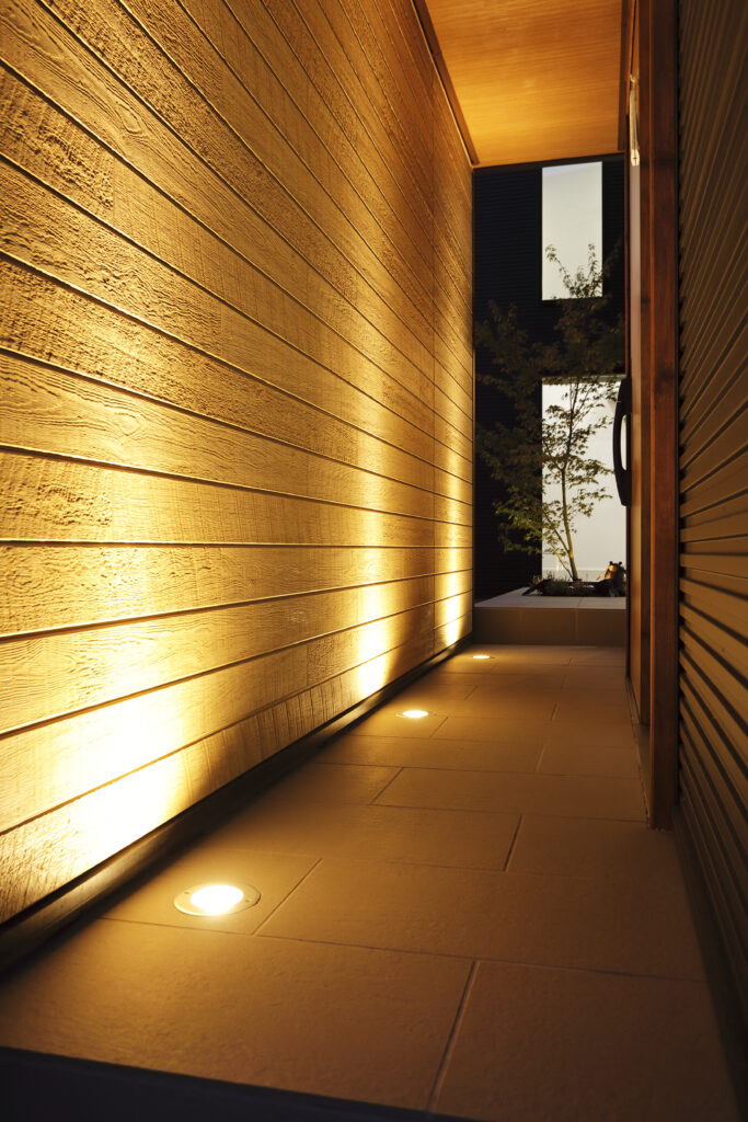 玄関ポーチには間接照明を設置し、夜家に帰るのが楽しくなりそうです。