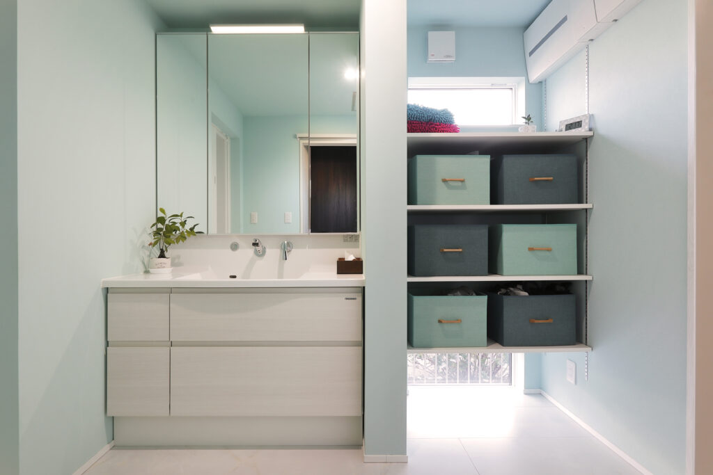 ランドリールームと洗面・脱衣室は、アクアブルーをアクセントクロスにして爽やかで清潔な空間です。