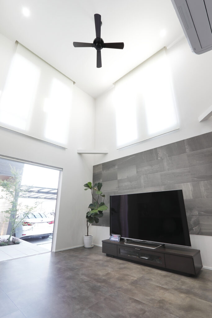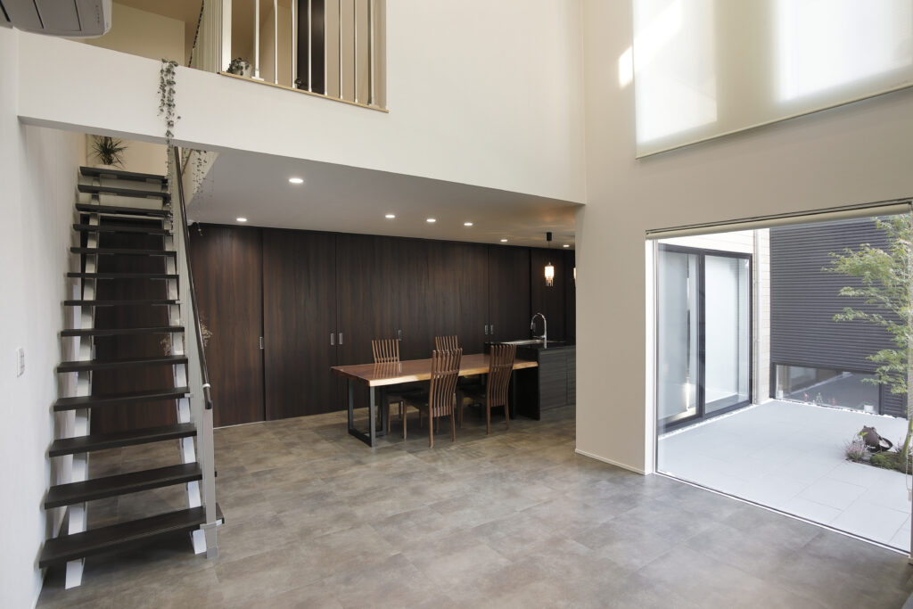 吹抜けからの光がリビングへ差し込み、白い壁とシックな床材がリビングの空間を落ち着いた雰囲気と温かい印象を持たせます。