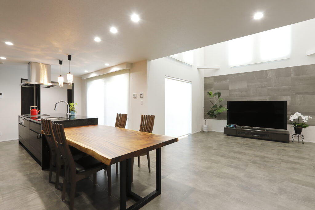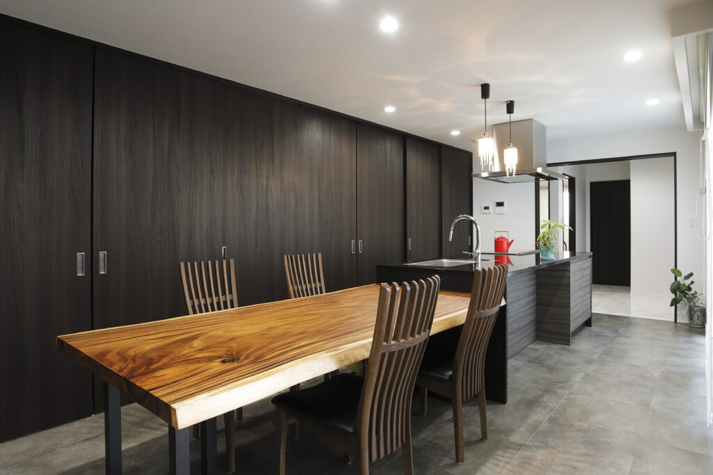 デザインが素敵なジュエルブラックのキッチンと天然目1枚板のダイニングテーブルがシンプルでスッキリとした空間を素敵に演出しています。