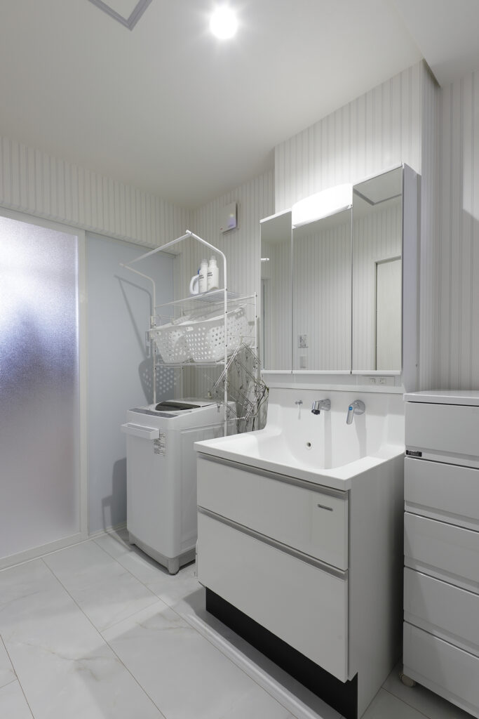 白で統一された清潔感ただよう洗面所。ストライプのアクセントクロスにしたスッキリとした空間。