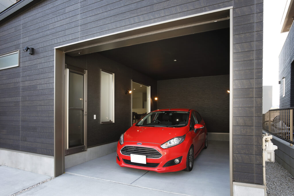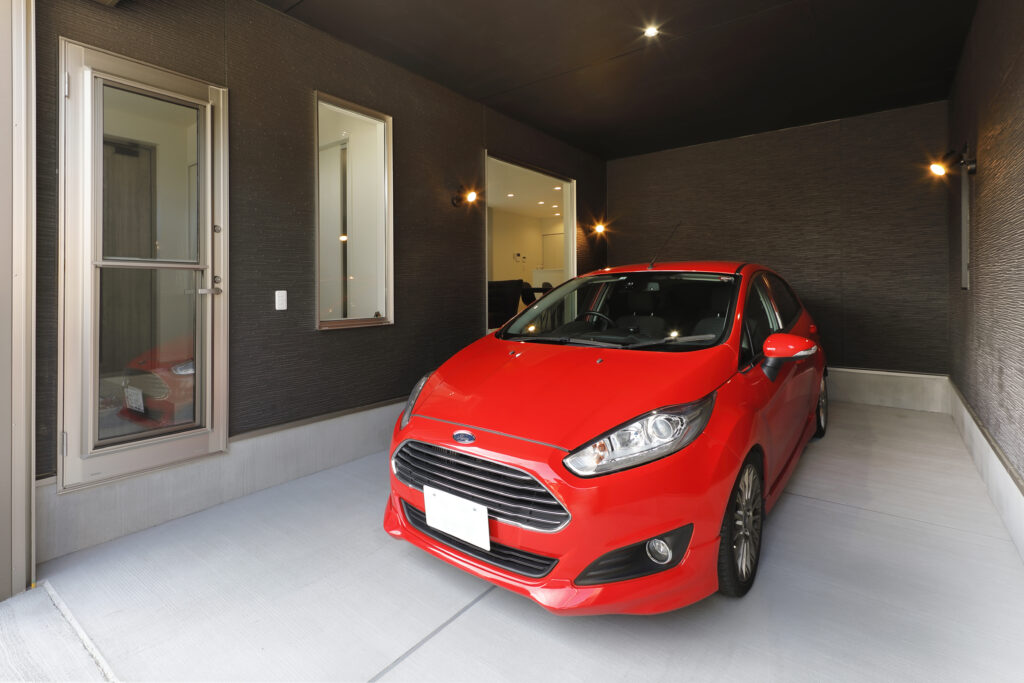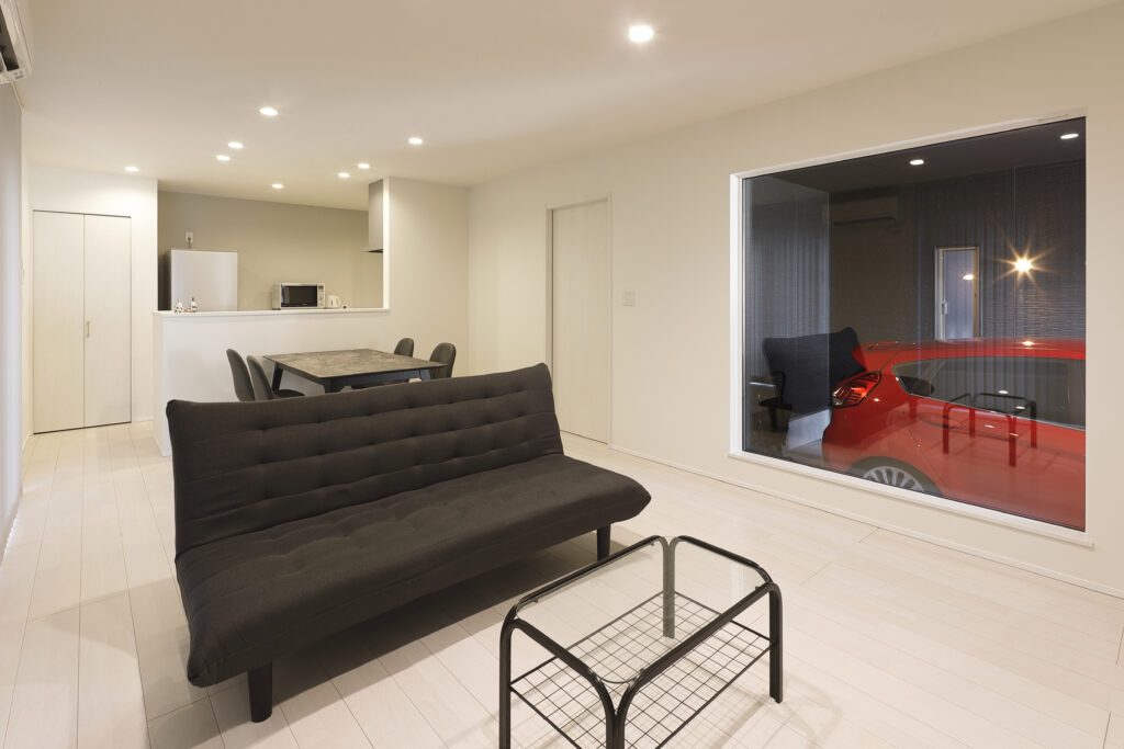 インナーガレージから趣味の車が鑑賞できる家