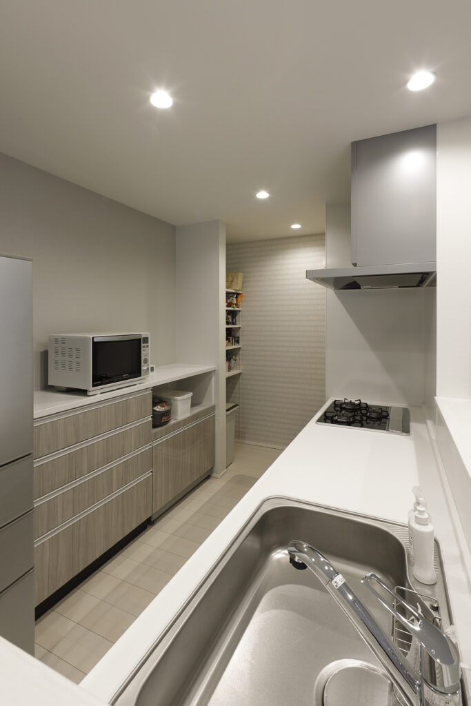 広めのキッチンはベージュと白を基調として清潔で明るく、シンプルで洗練されています。