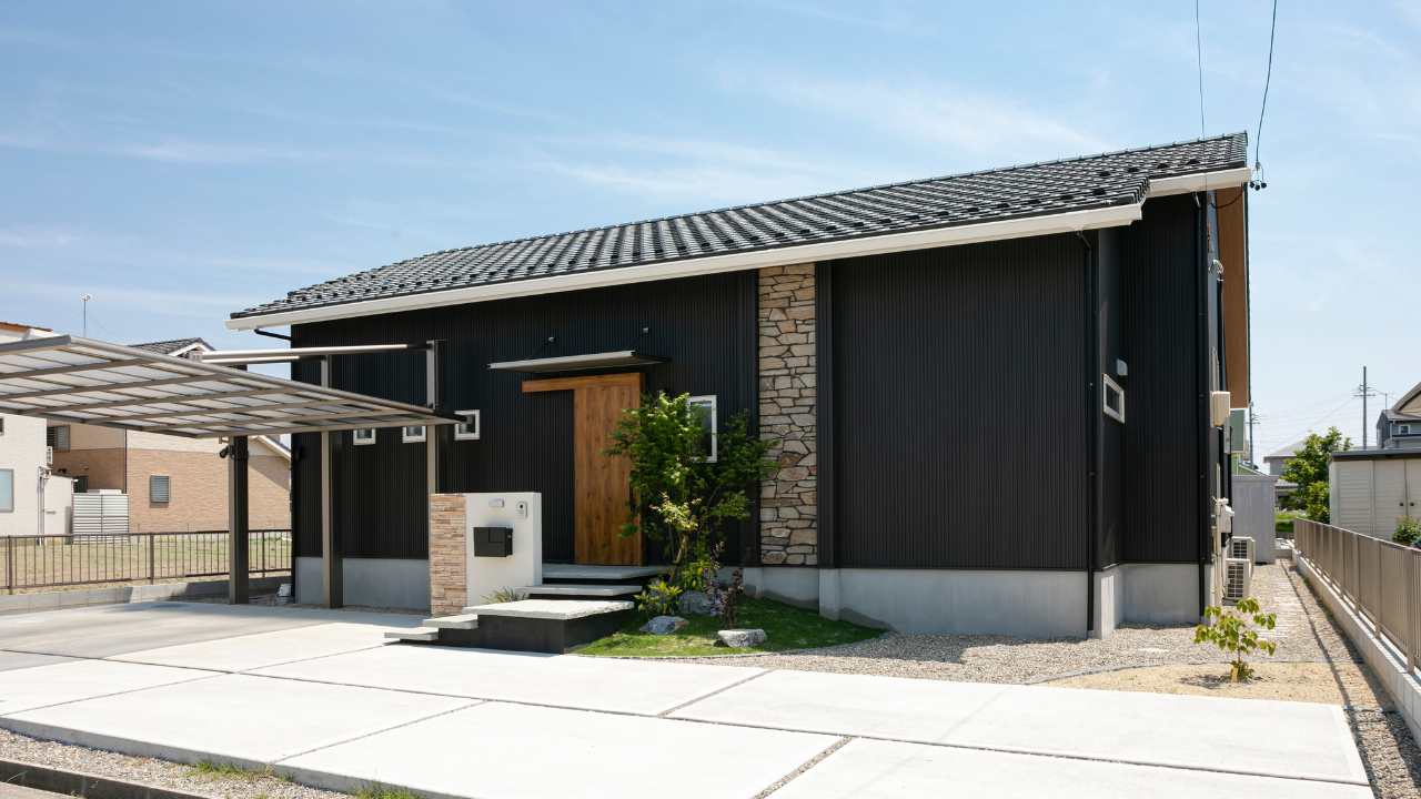 ダークブラウンのサイディングが落ち着いた印象で、ご主人自慢の愛車が一層引き立つシンプルでモダンな外観。