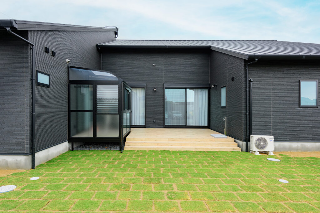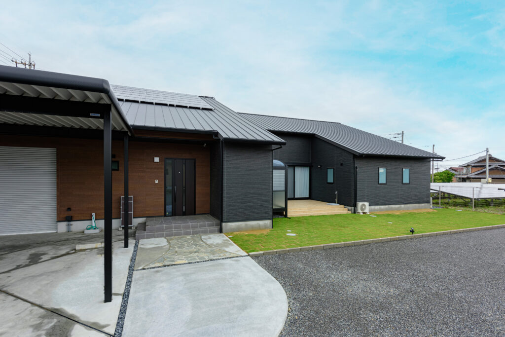 黒の外壁と大屋根が存在感を放つ広々とした平屋。大容量の太陽光発電・蓄電池で光熱費を節約。