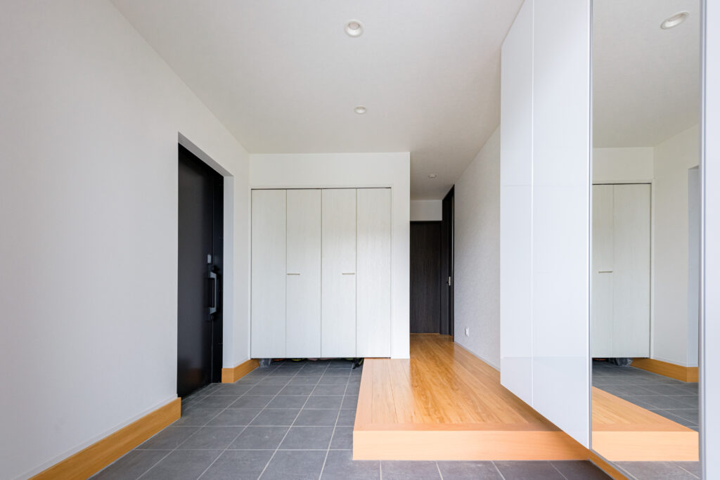 来客と会話が弾む広い玄関。土間収納もあり収納が充実。
