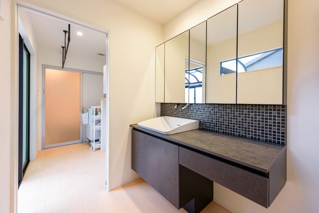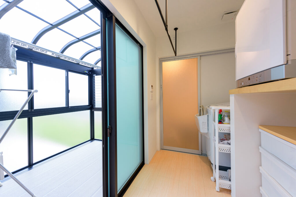 洗面室とつながっている脱衣室には物干しスペースも。型ガラス窓でプライバシーを確保。