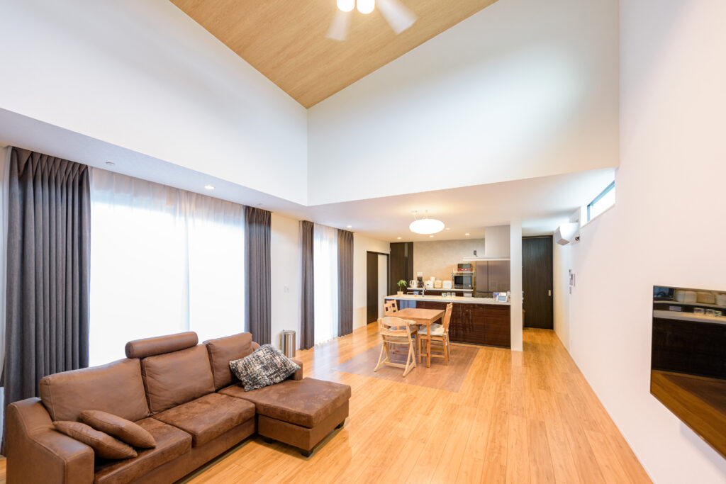 25帖の広々としたLDKに勾配天井でより広く感じる空間に。リビングの窓からは日差しが入り、とても明るく快適に過ごせます。