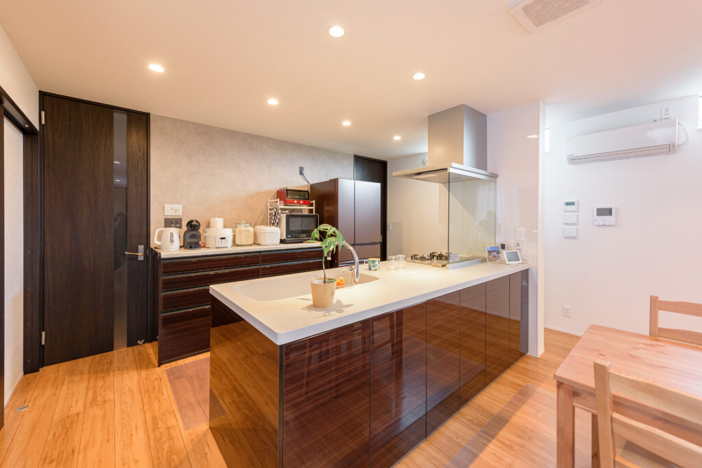 回遊できるペニンシュラキッチン。高級感のあるキッチンには全面収納もあり収納力抜群。