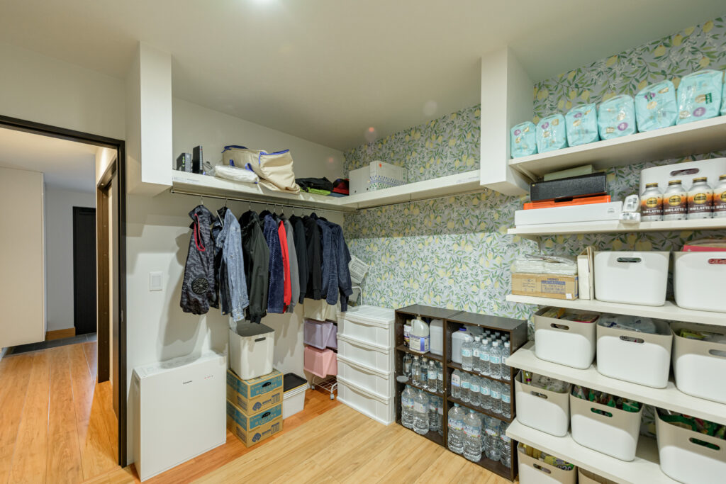 キッチン用品と洋服が収納できるパントリー兼クローゼット。壁一面をアクセントクロスにすることで一気にお洒落な空間に。