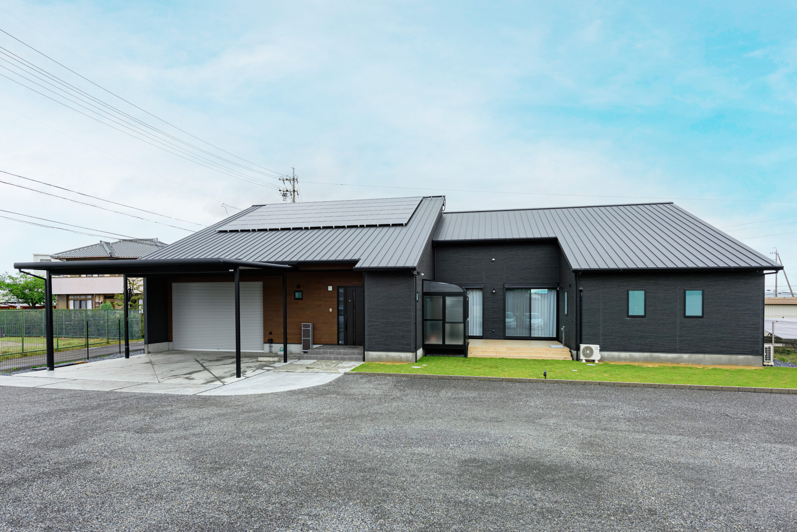 黒の外壁と大屋根が存在感を放つ広々とした平屋。大容量の太陽光発電・蓄電池で光熱費を節約。